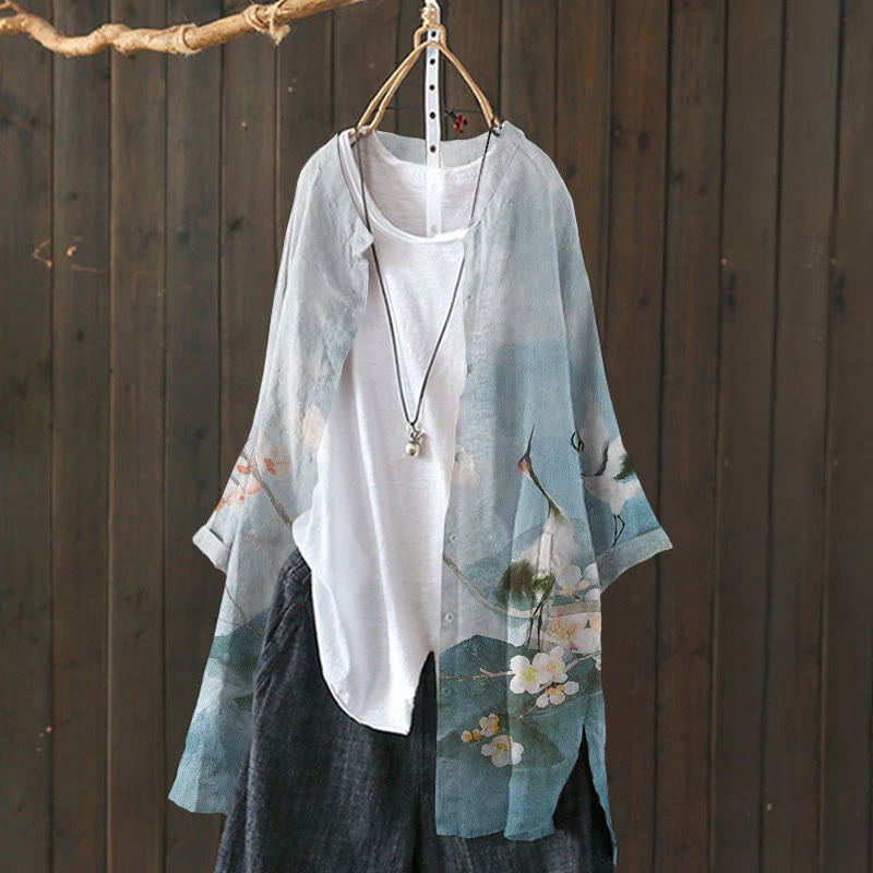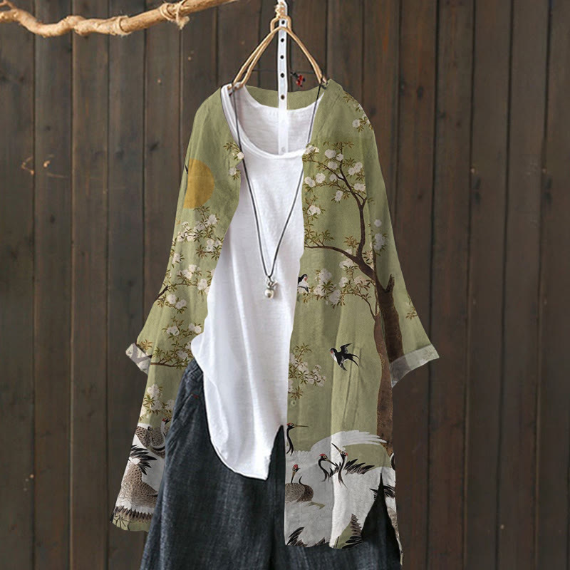 Dashingsoul Japanese Style Red-crowned Crane Under Plum Blossom Print Cardigan