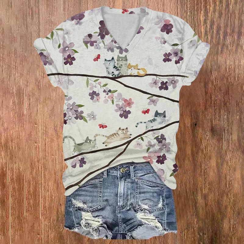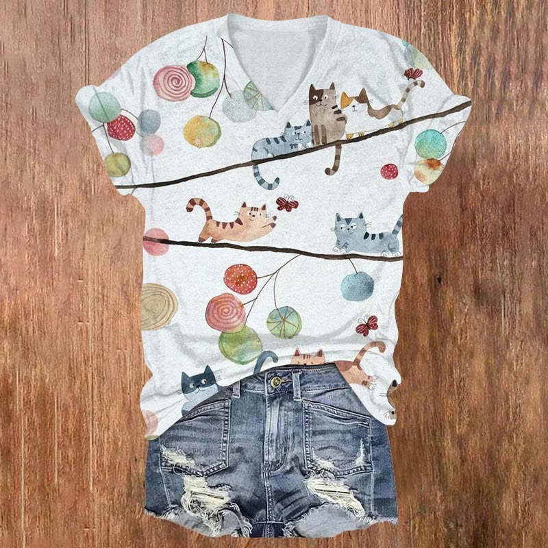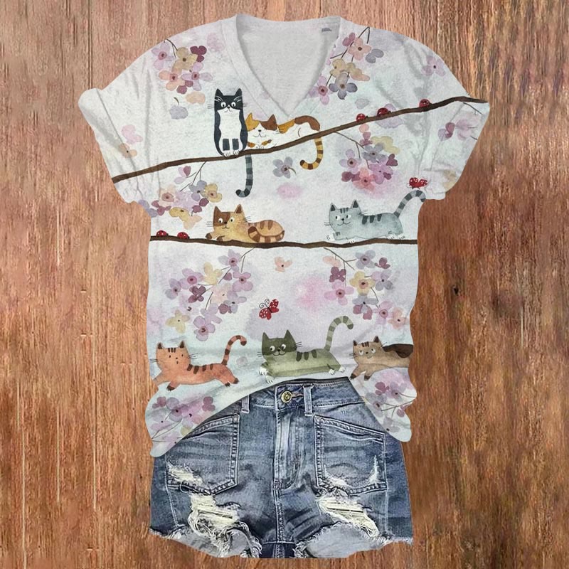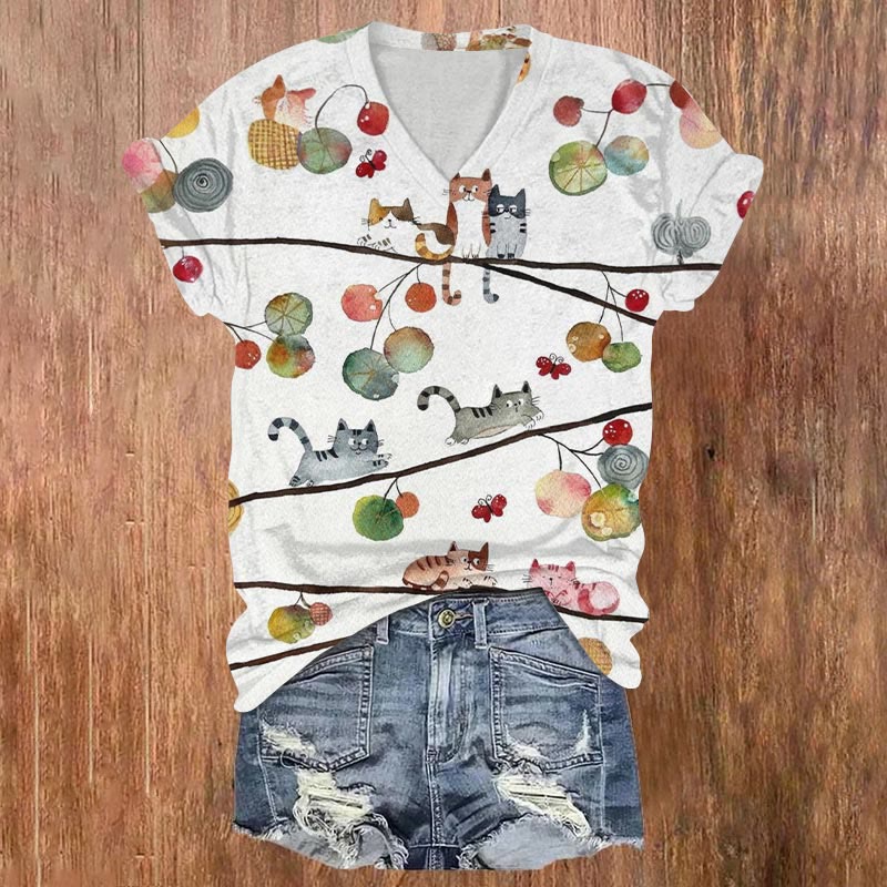 Dashingsoul Cats Chasing Each Other In A Tree Print Casual V-neck T-shirt