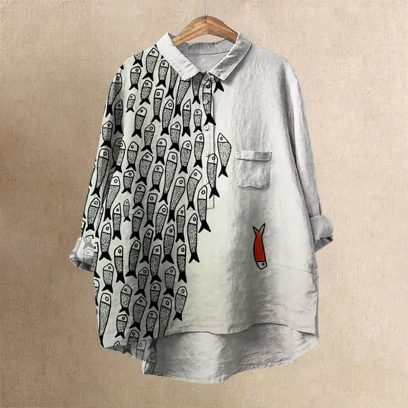 Dashingsoul Cute Simple Lines Abstract Geometric Fish Art Print Casual Lapel Loose Blouse