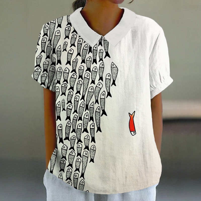 Dashingsoul Cute Simple Lines Abstract Geometric Fish Art Print Casual Lapel Blouse