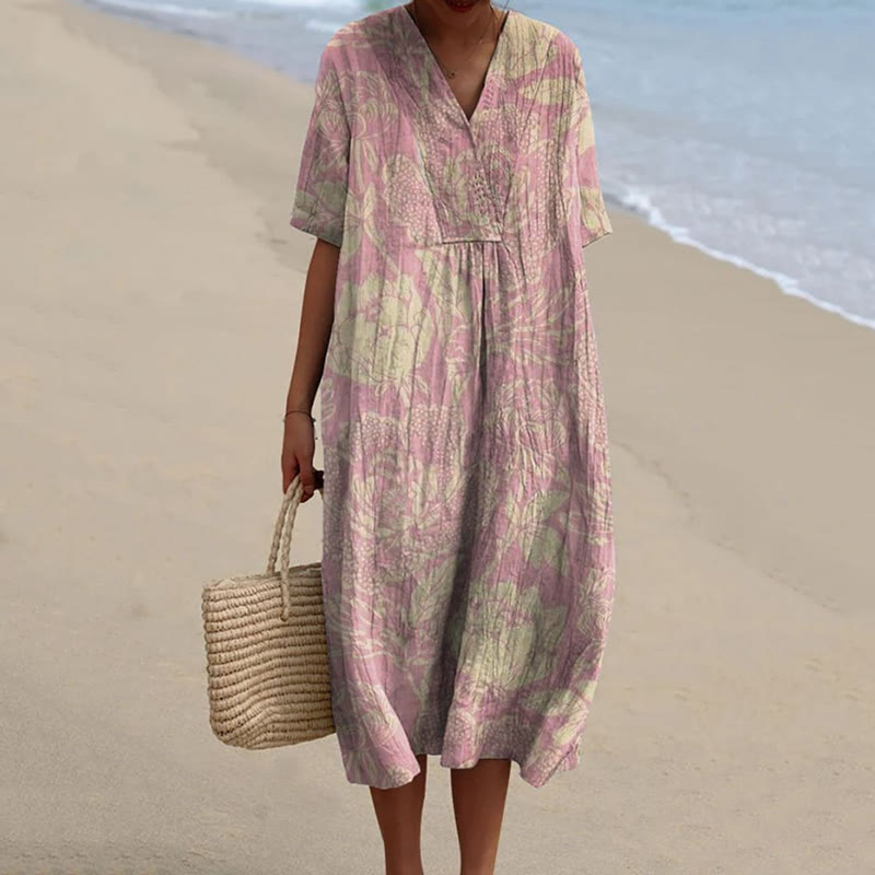 Dashingsoul Vintage Floral Art Print V-neck Short Sleeved Casual Midi Dress