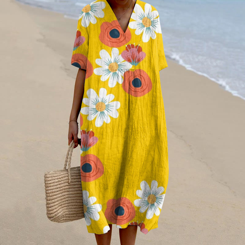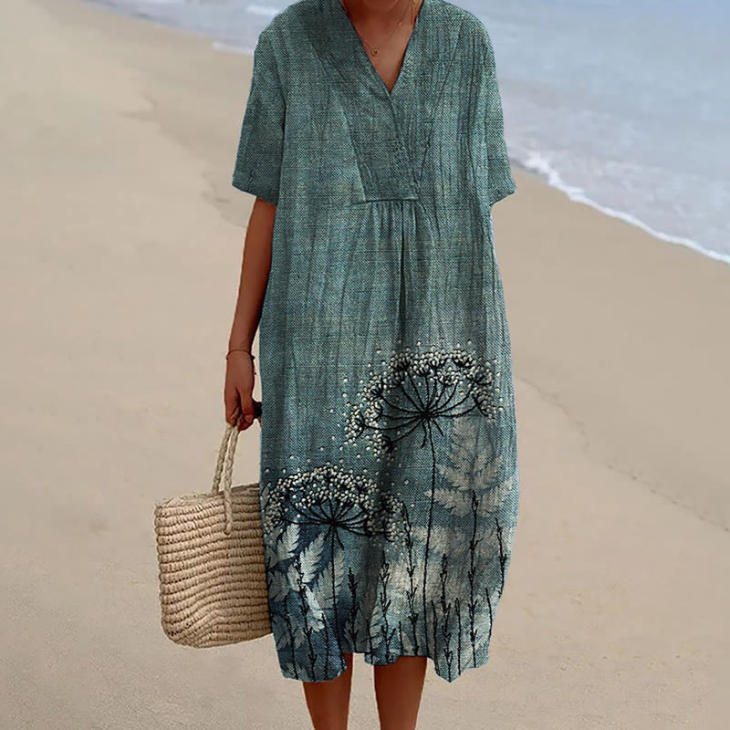 Dashingsoul Vintage Dandelion Floral Print V Neck Short Sleeved Casual Midi Dress