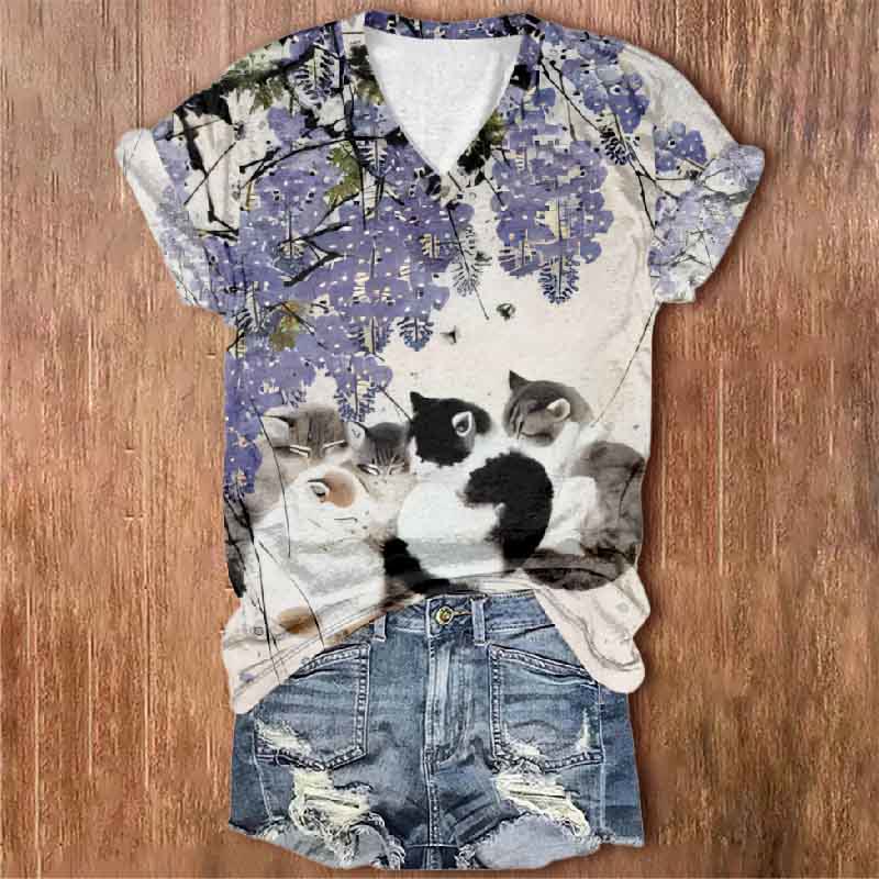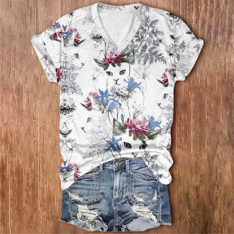 Dashingsoul Abstract Smiling Kitten Surrounded By Flowers Print V-neck T-shirt