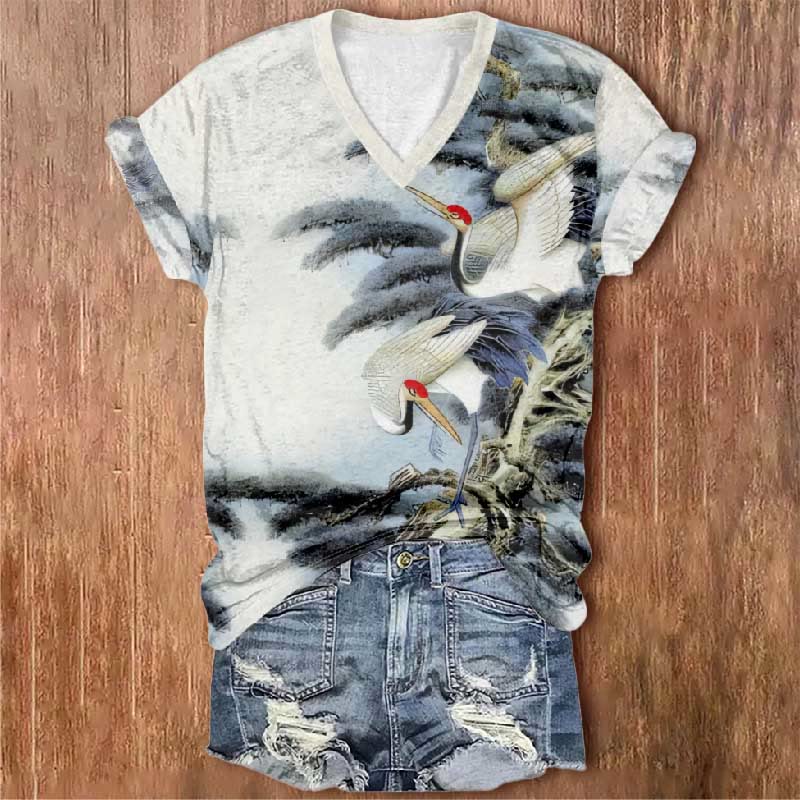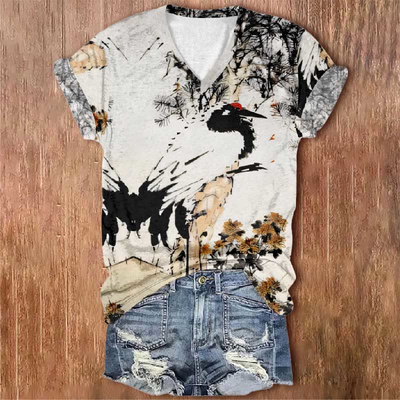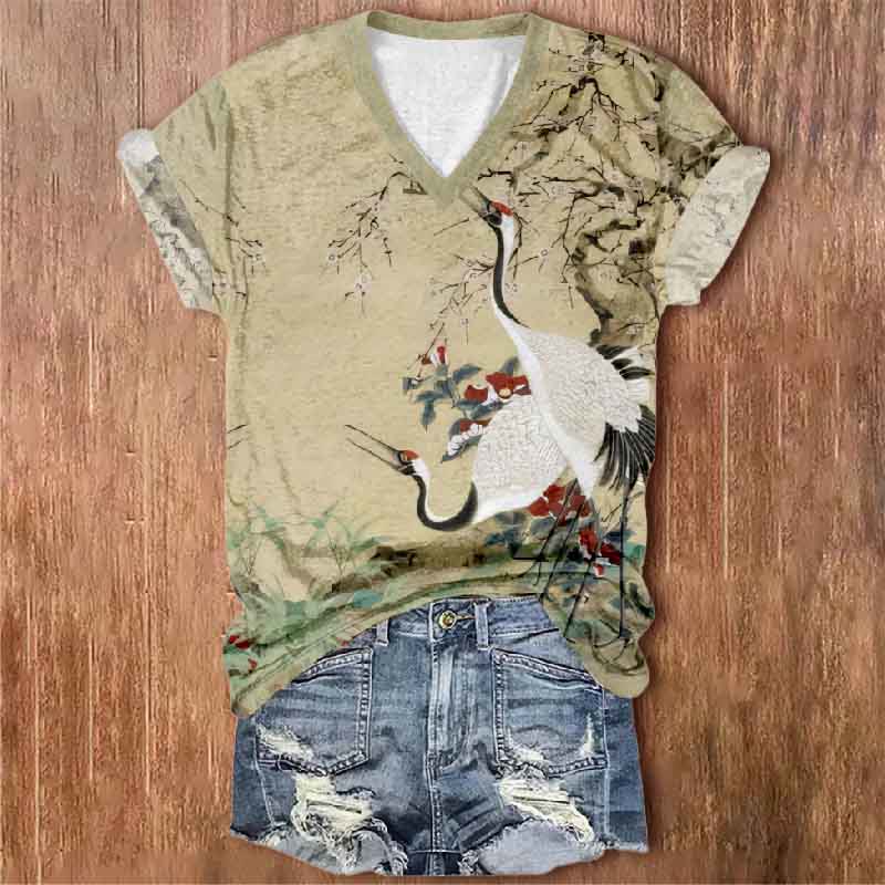 Dashingsoul Japanese Style Oil Painting Crane Print V-neck T-shirt