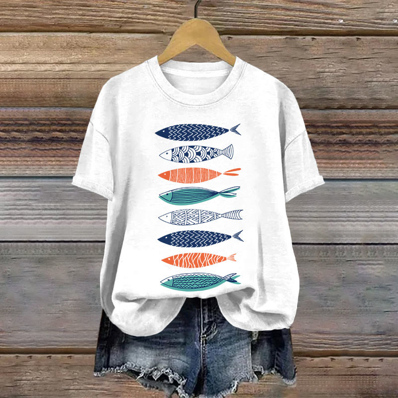 Dashingsoul Cotton Cute Japanese Simple Geometric Fish Print T-shirt