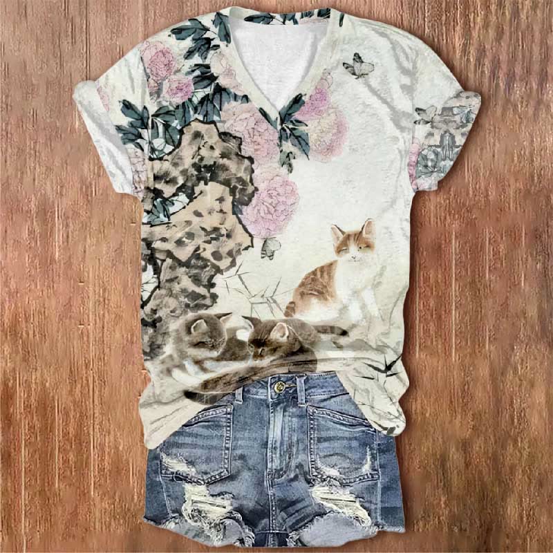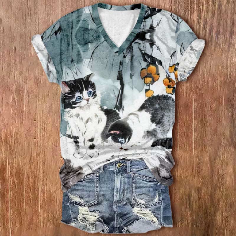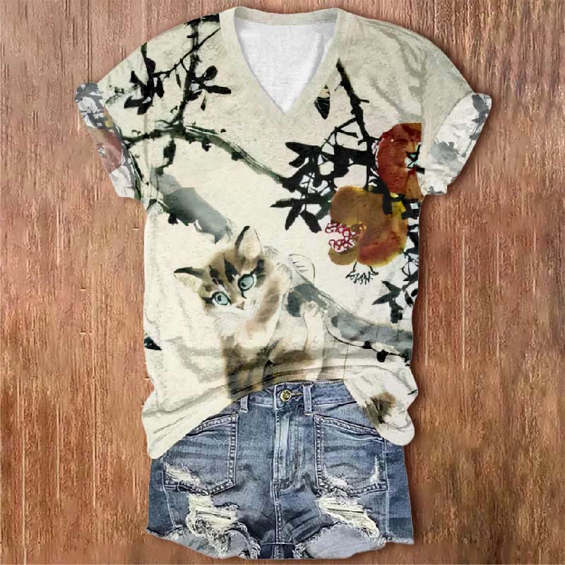 Dashingsoul Abstract Ink Painting Cat Floral Print V-neck T-shirt