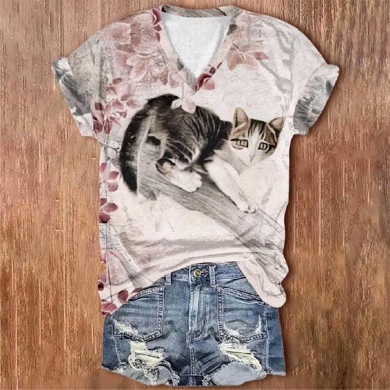 Dashingsoul One Lovely Cat Watching Another Floral Art Print V-neck T-shirt