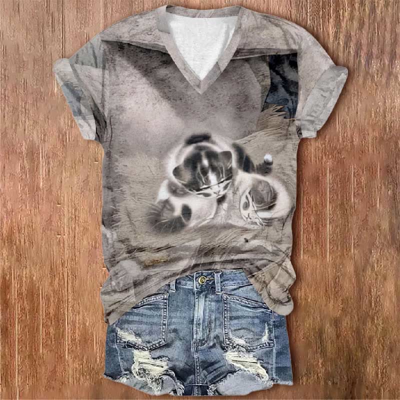 Dashingsoul Oil Painting Cute Cats Playing Art Print V-neck T-shirt