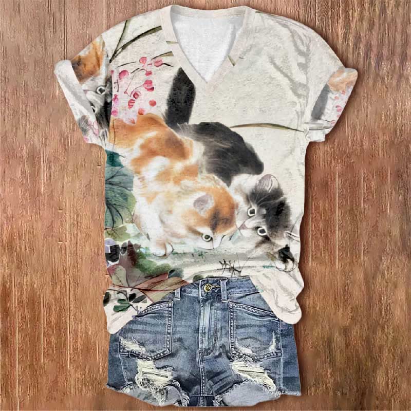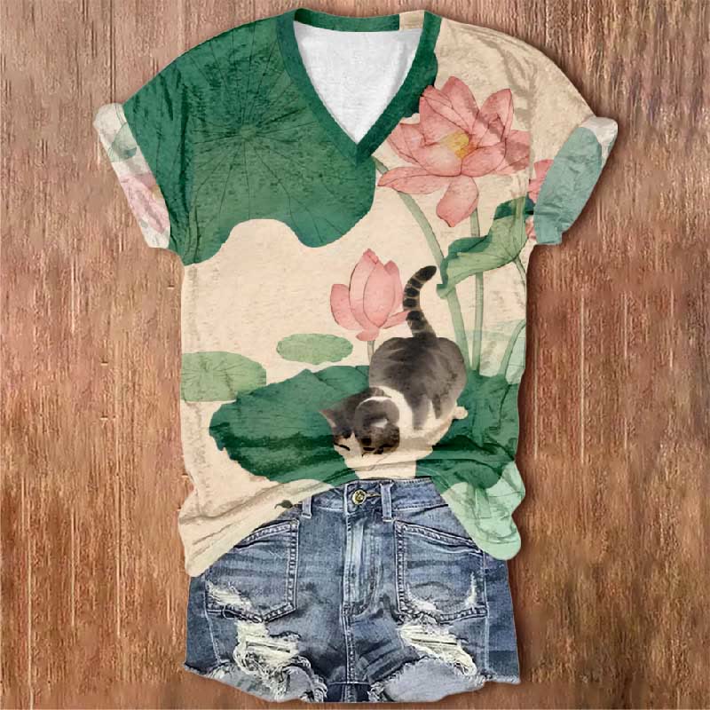 Dashingsoul Watercolor Lotus Blossom Cute Cat Print V-neck T-shirt