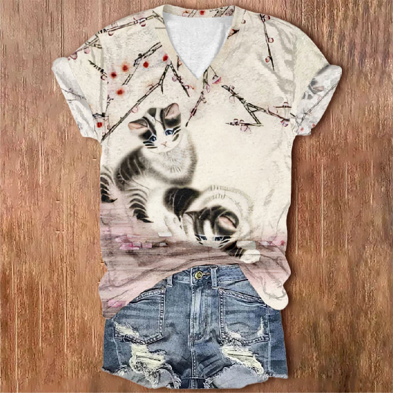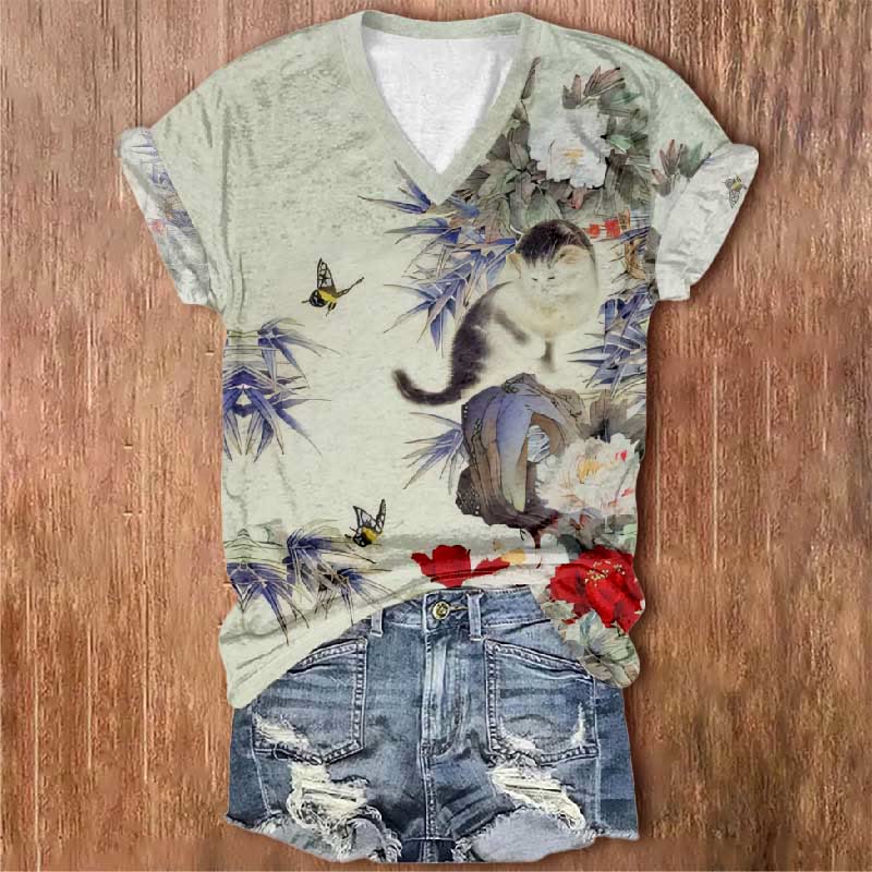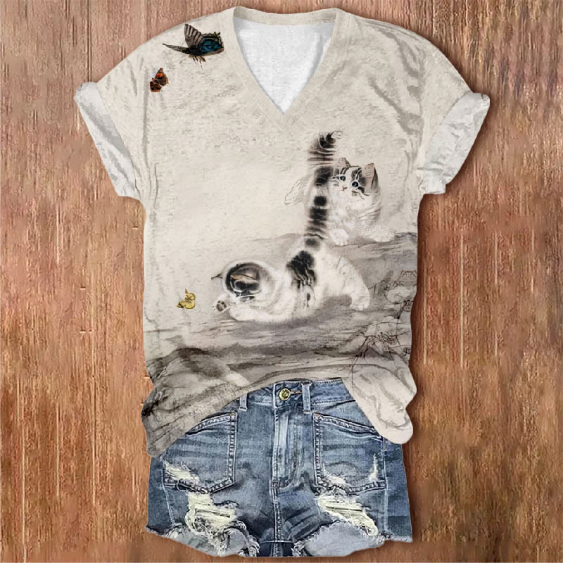 Dashingsoul Women's Japanese Style Cute Cat Chasing Butterfly Print V-neck T-shirt