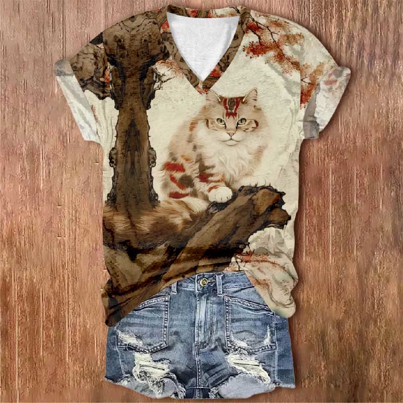 Dashingsoul Oil Painting Staring Cat On The Maple Tree Art Print V-neck T-shirt