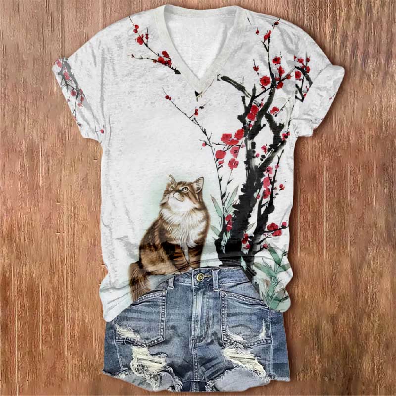 Dashingsoul Women's Ink Watercolor Painting Wintersweet And Cats Print V-neck T-shirt