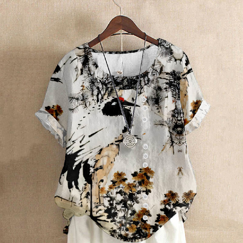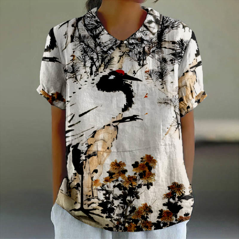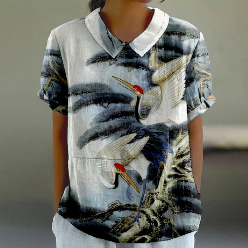 Dashingsoul Women's Japanese Style Oil Painting Crane Art Print Blouse