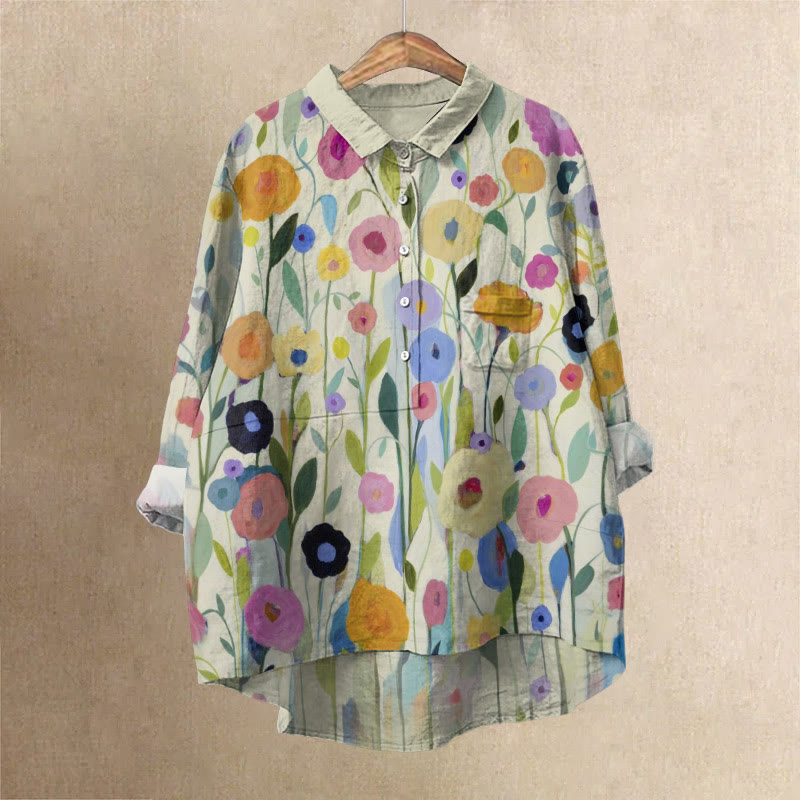 Dashingsoul Oil Painting Spring Field Art Print Casual Lapel Blouse
