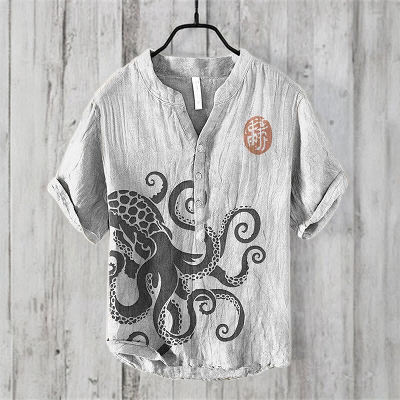 Dashingsoul Japanese Vintage Octopus Linoleum Art Print Casual Shirt