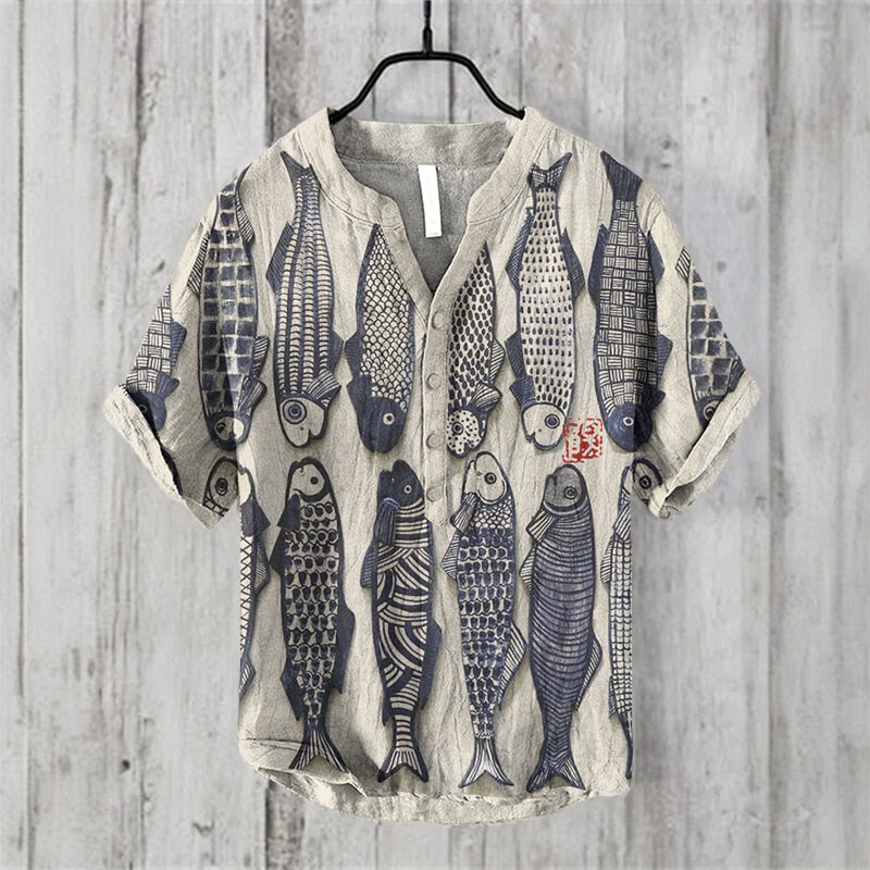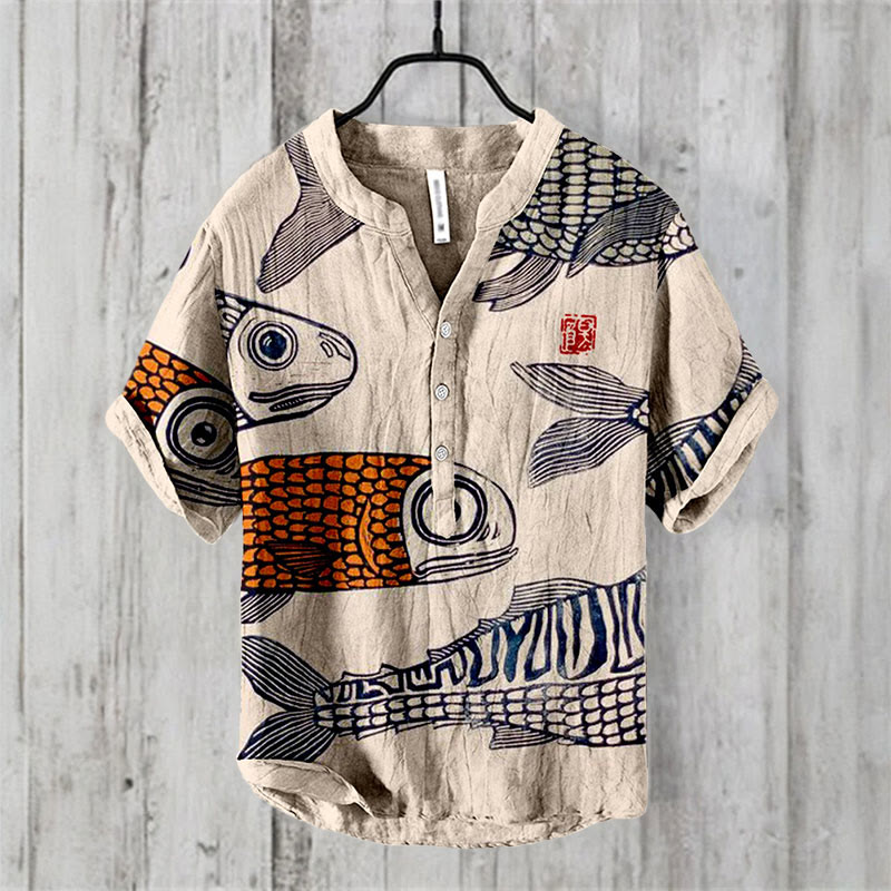 Dashingsoul Vintage Fish Japanese Lino Art Print Casual Shirt