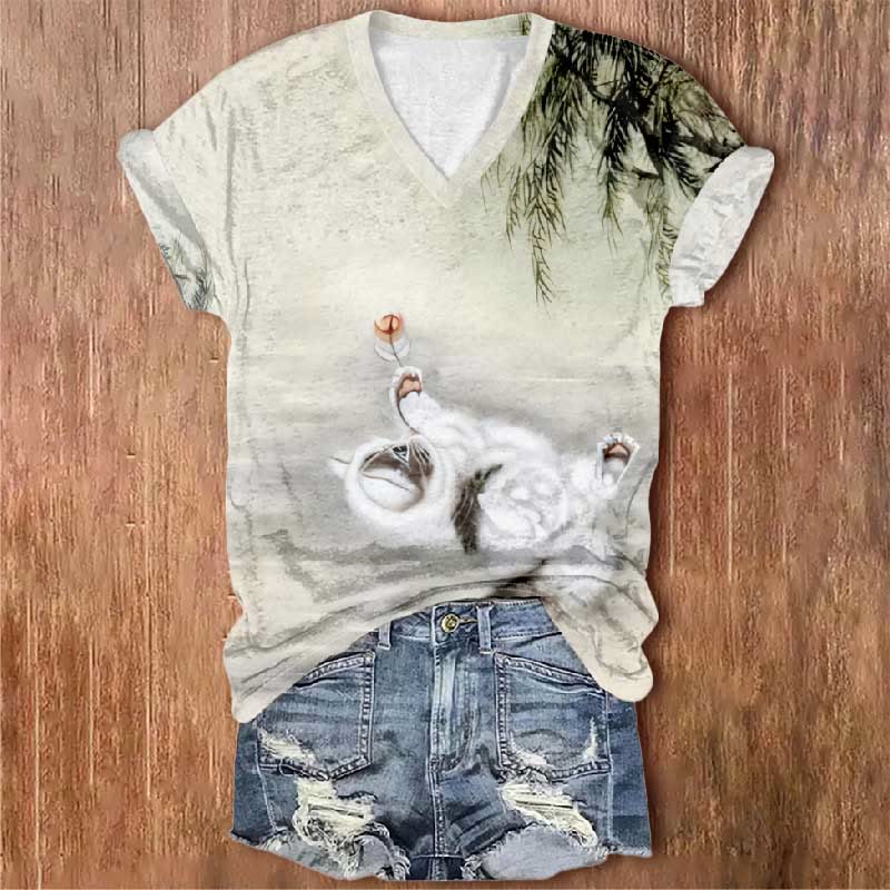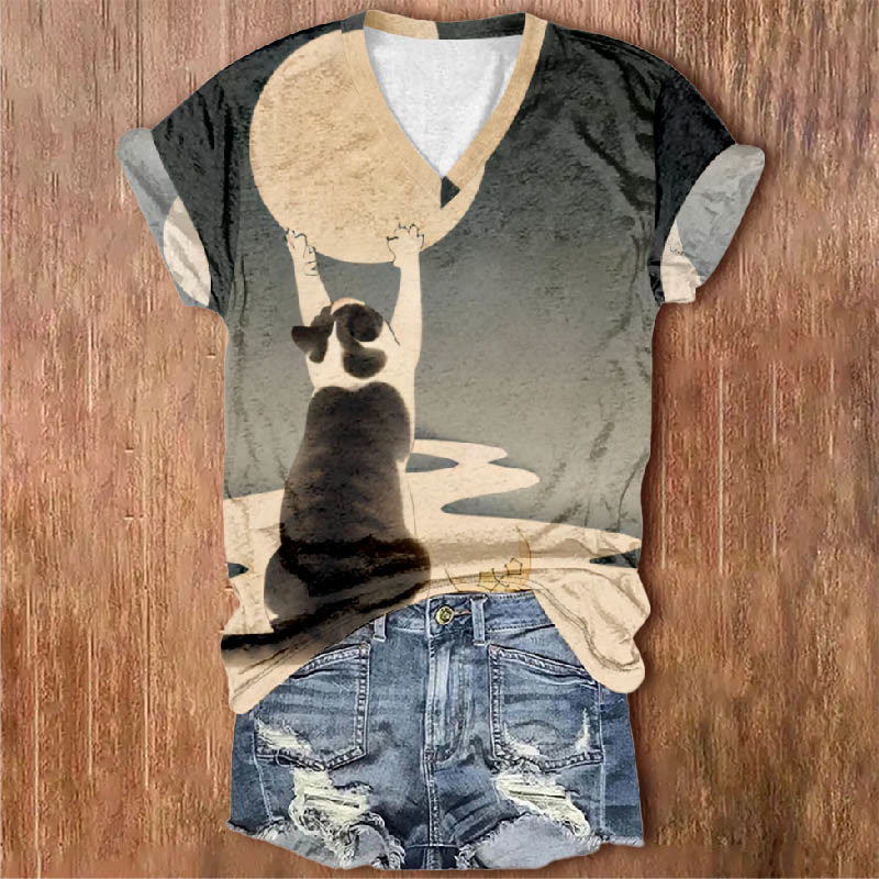Dashingsoul Women's Creative Cat Catching The Moon Print V-neck T-shirt