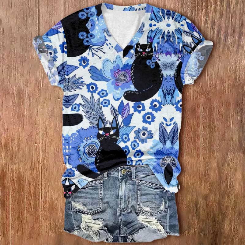 Dashingsoul Women's Fantasy Flowers And Black Cats Print V-neck T-shirt