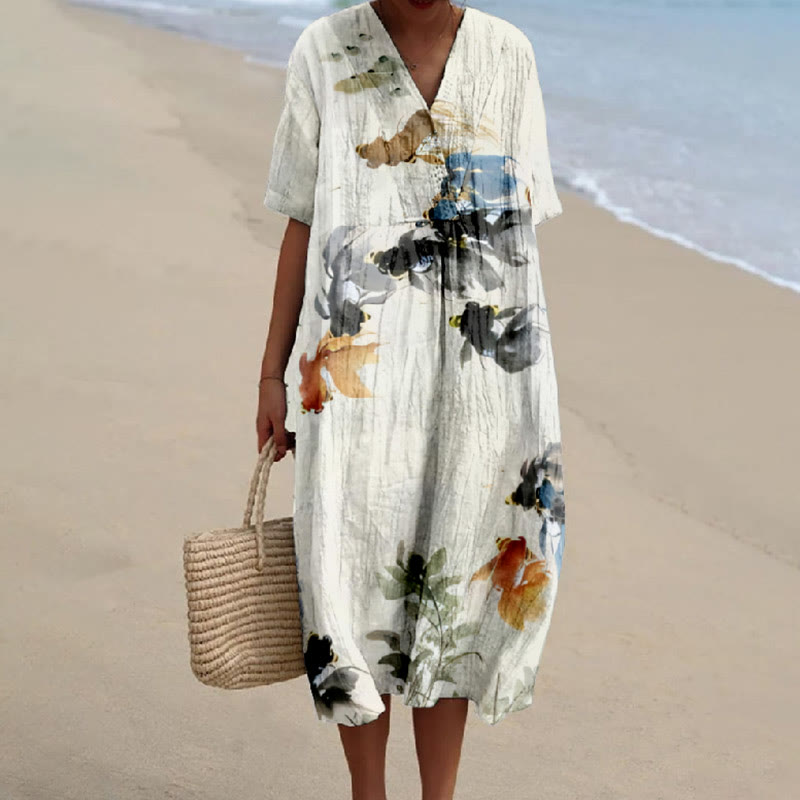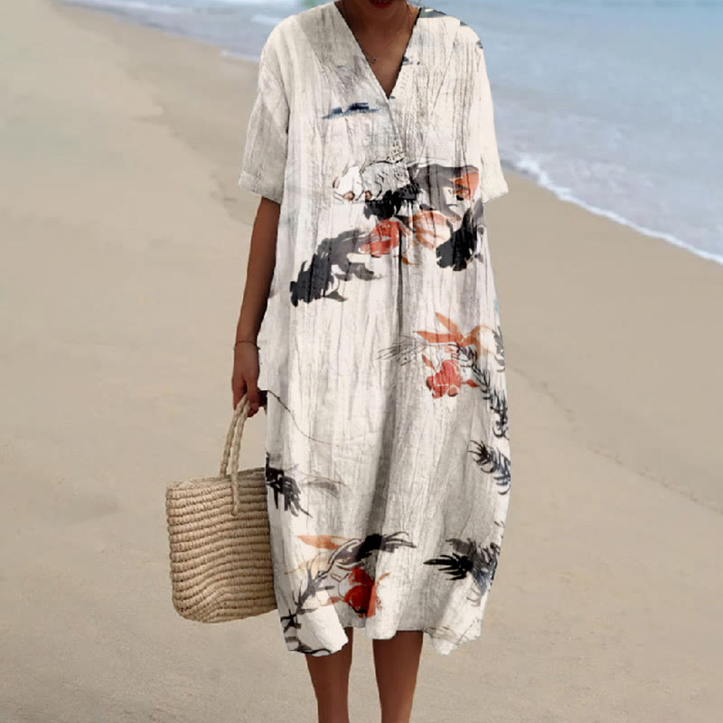 Women's Watercolor Painting Goldfish Art Printed Short-sleeved Midi Dress