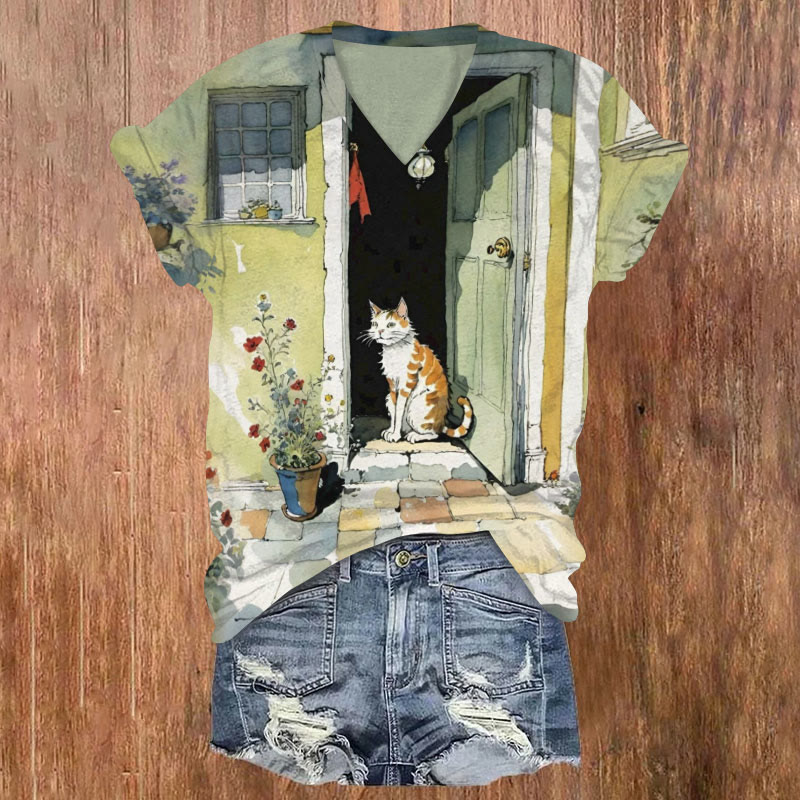 Dashingsoul Cat Landscape Art Print V-neck T-shirt