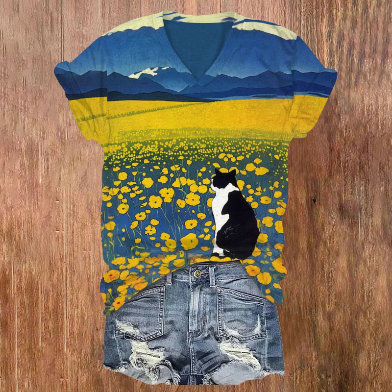 Dashingsoul Flower Sea Cat Art Print V-neck T-shirt