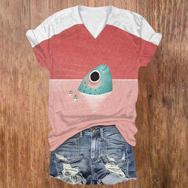 Dashingsoul Colorblock Fish Art Print V-neck T-shirt
