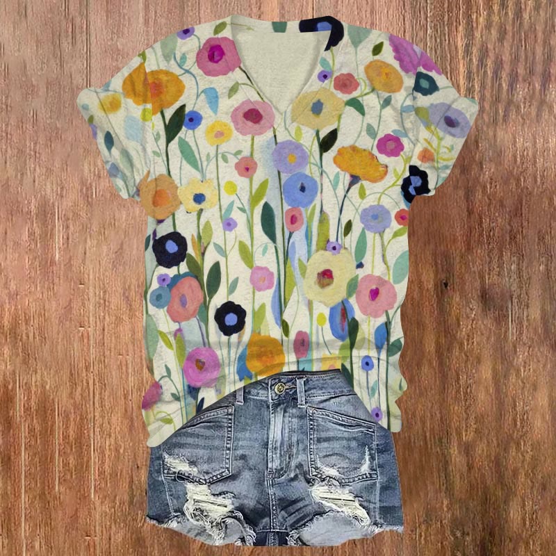 Dashingsoul Oil Painting Spring Field Art Printed V-neck T-shirt