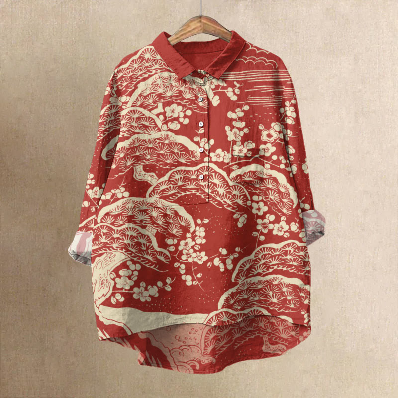 Dashingsoul Women's Japanese Art Plum Blossom Print Casual Lapel Loose Blouse