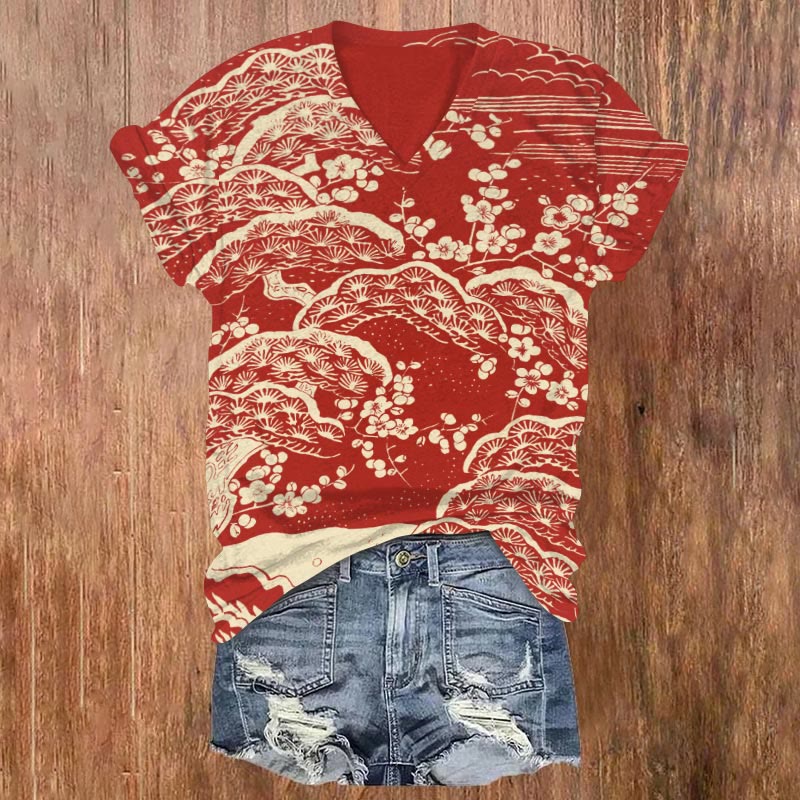 Dashingsoul Women's Japanese Art Plum Blossom Art Print V-neck T-shirt
