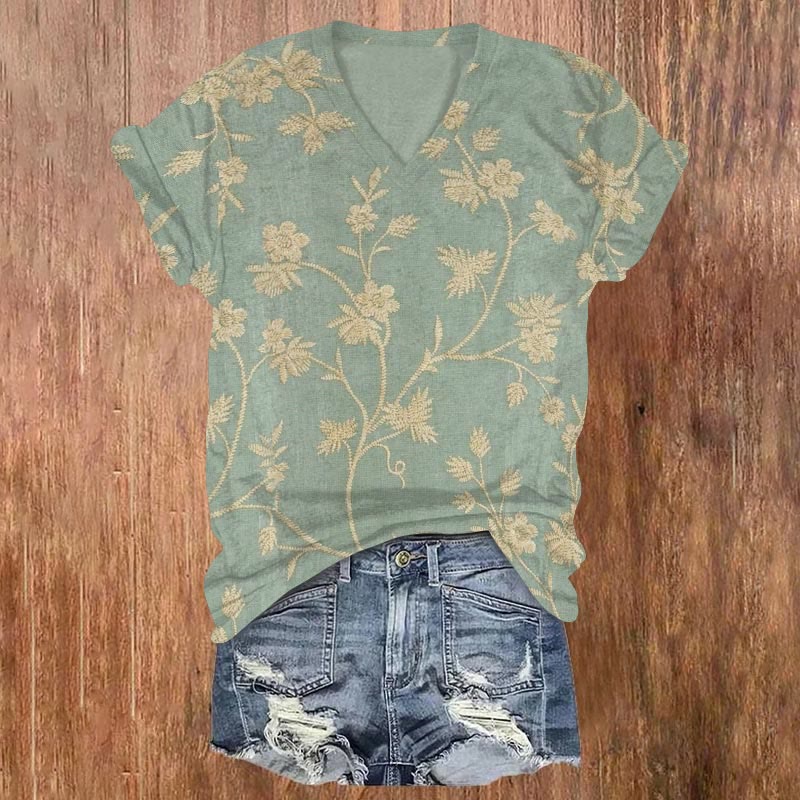 Dashingsoul Women's Retro Floral Art Print V-neck T-shirt