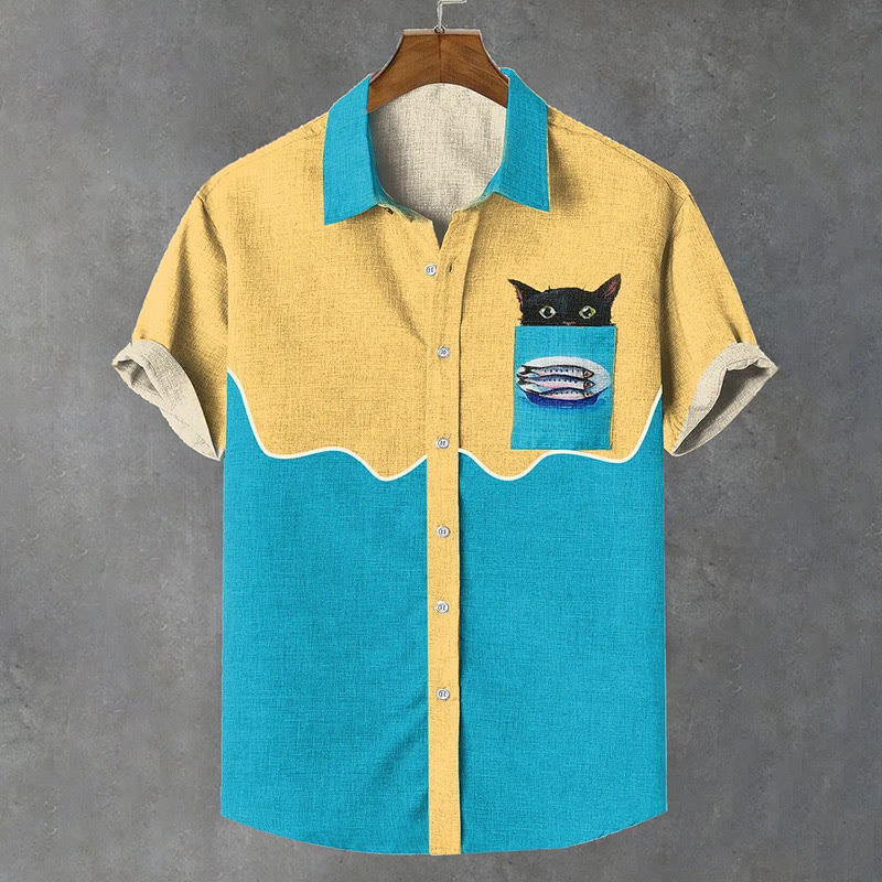 Dashingsoul Summer Men's Retro Fun Eat Fish Black Cat Contrast Color Art Print Short Sleeve Lapel Shirt