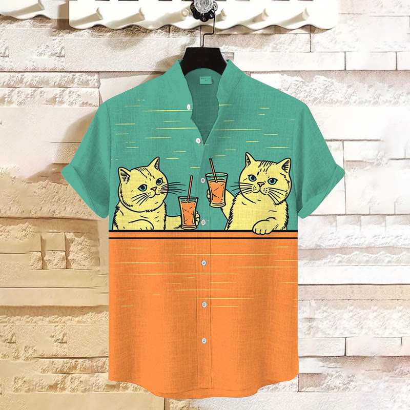 Dashingsoul Men's Cocktail Cheers Cat Vintage Style Print Casual Shirt