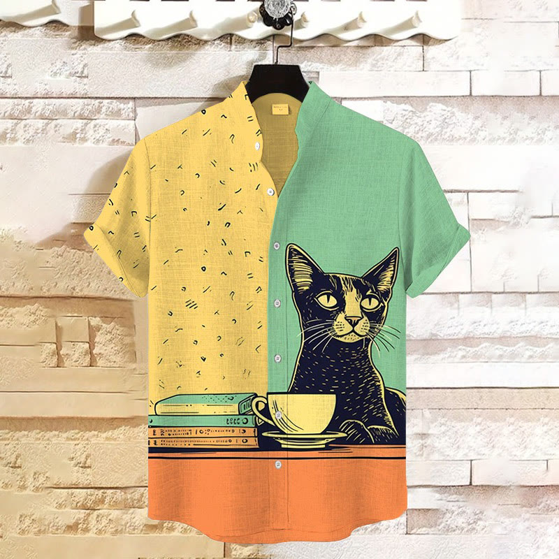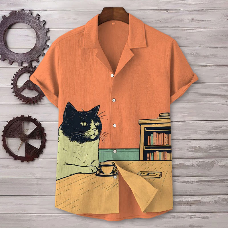 Dashingsoul Men's Cat Chilling With Coffee Print Short Sleeve Cuban Collar Shirt