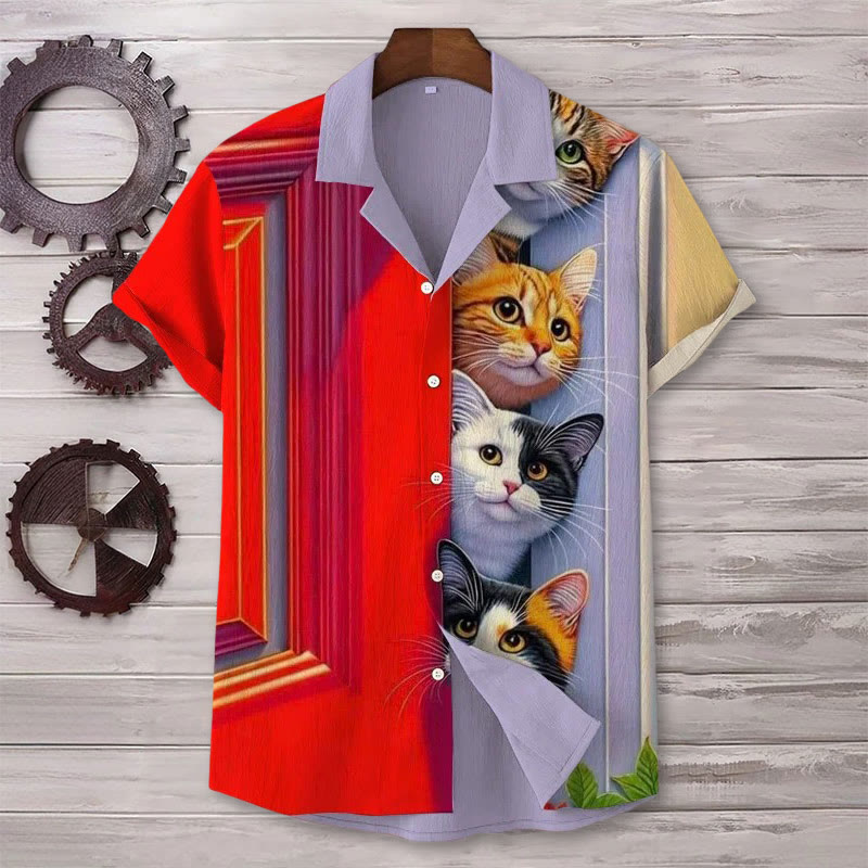 Dashingsoul Men's Cats By Door Art Print Short Sleeve Cuban Collar Shirt