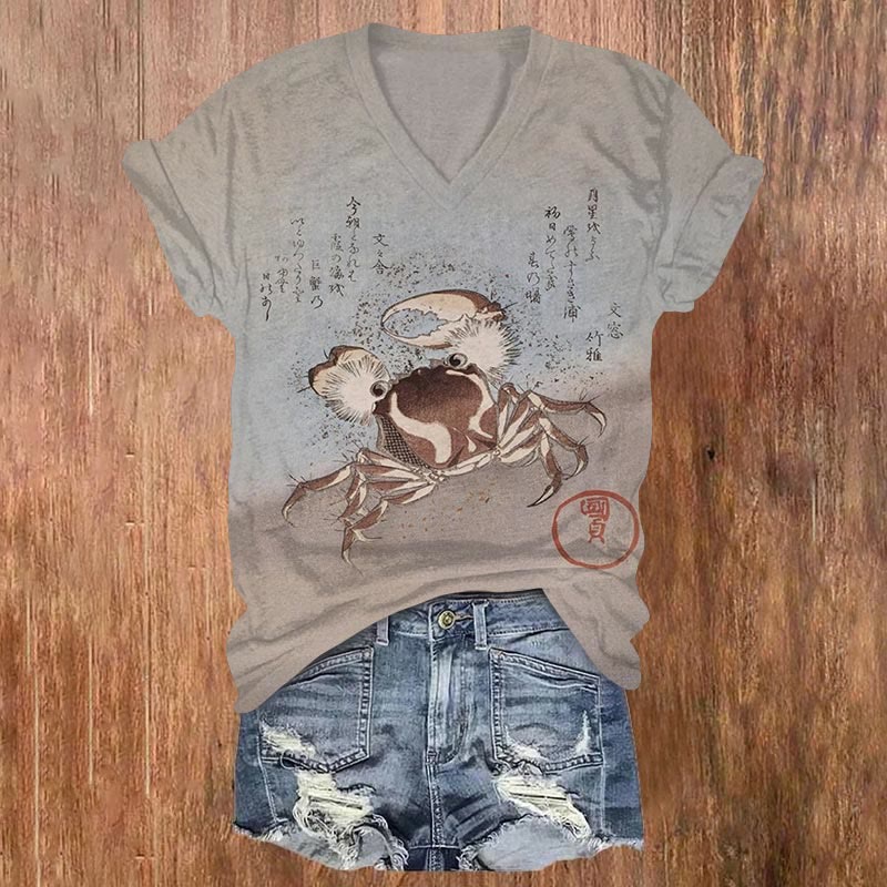 Dashingsoul Vintage Japanese A Crab On The Seashore Art Print V-neck T-shirt