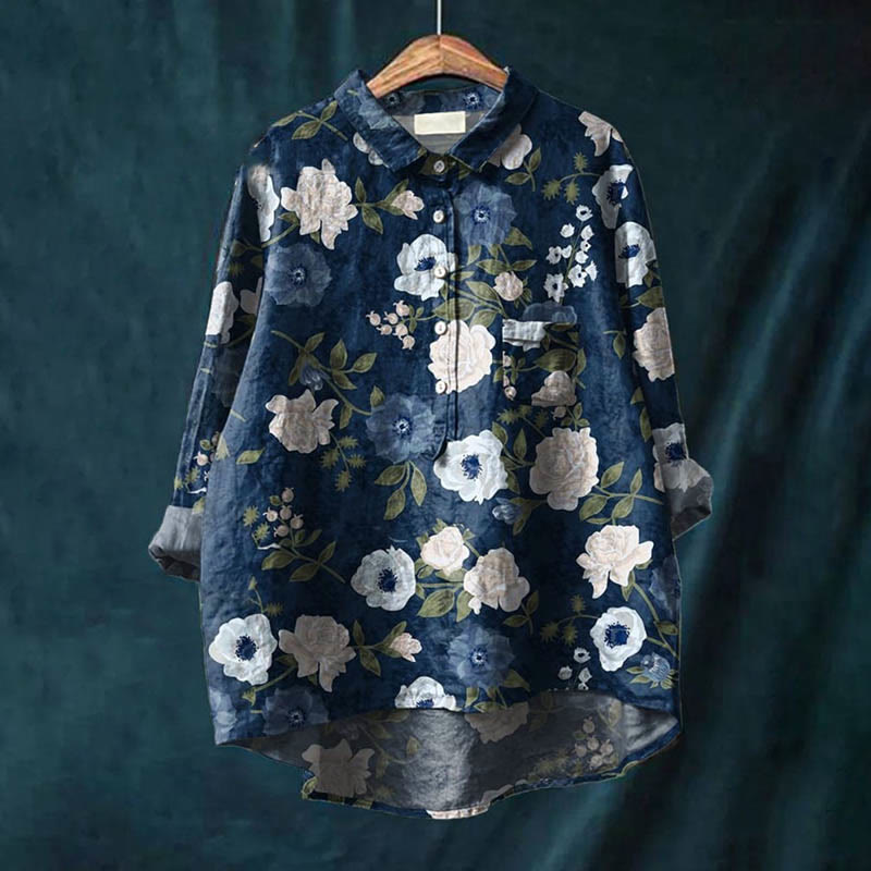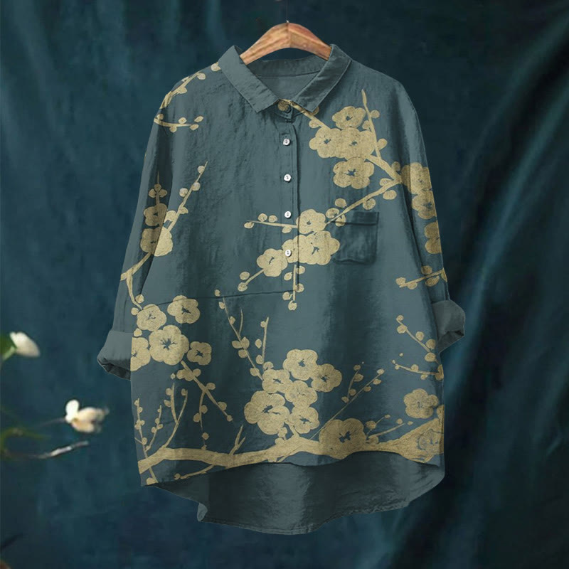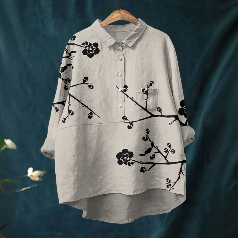 Dashingsoul Women's Vintage Pear Blossom Art Print Casual Lapel Blouse