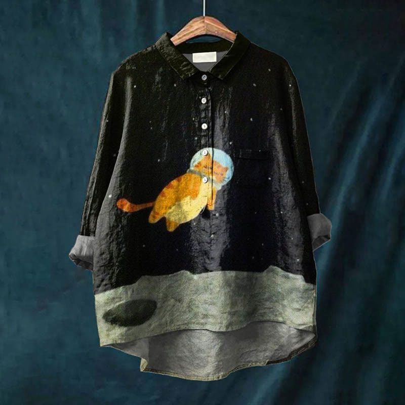 Dashingsoul Women's Creative Cat Flying On The Moon Art Print Casual Lapel Blouse