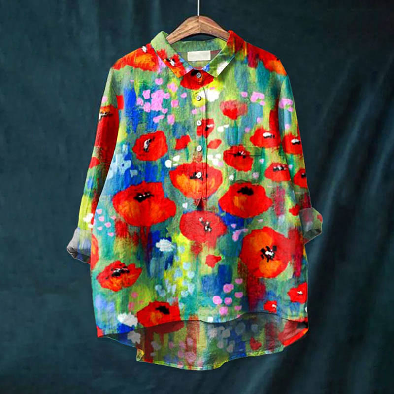 Dashingsoul Women's Oil Painting Rosa Chinensis Blossom Art Print Casual Lapel Blouse