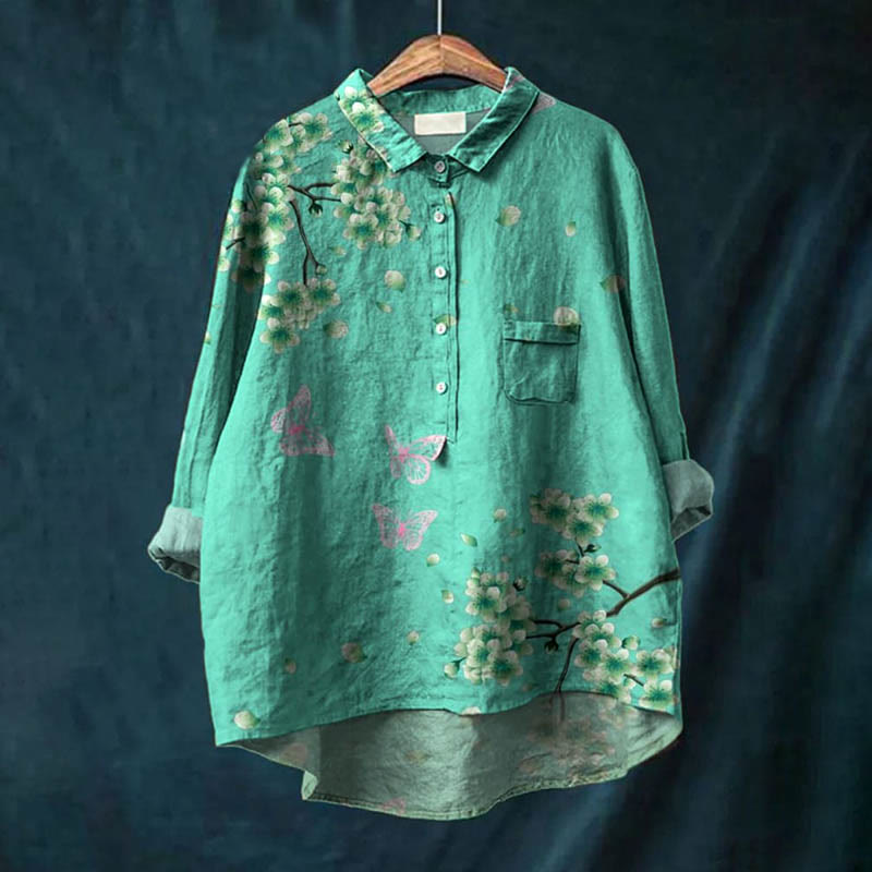 Dashingsoul Women's Classic Pear Blossoms Falling Butterfly Art Print Casual Lapel Blouse