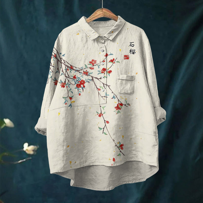 Dashingsoul Women's Watercolor Painting Pomegranate Flower Art Print Casual Lapel Blouse