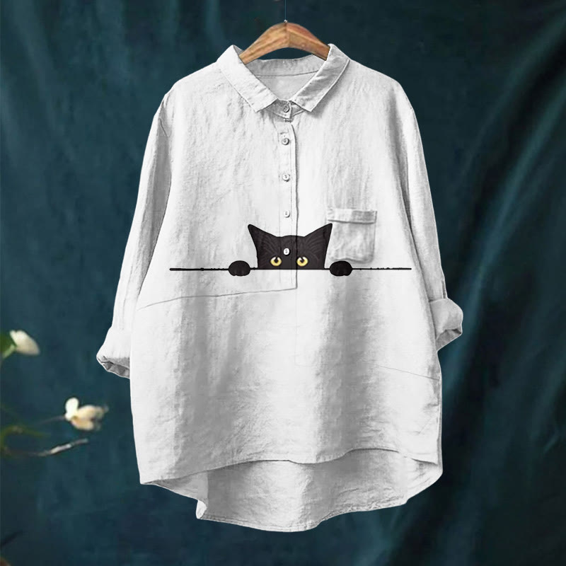 Dashingsoul Women's Funny Peeping Little Cat Art Print Casual Lapel Blouse