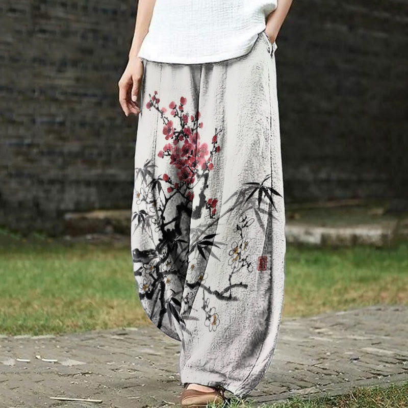Dashingsoul Women's Japanese Retro Spring Blossoms Ink Painting Art Print Casual Pants