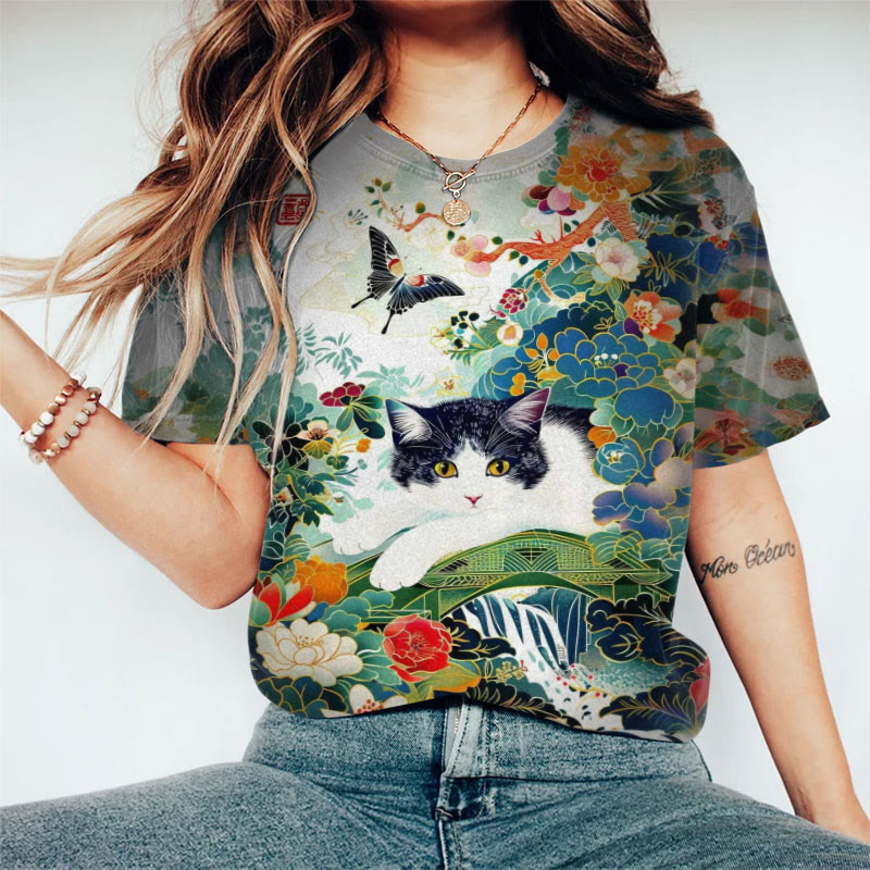 Dashingsoul Japanese Retro Floral Cat Art Print T-shirt