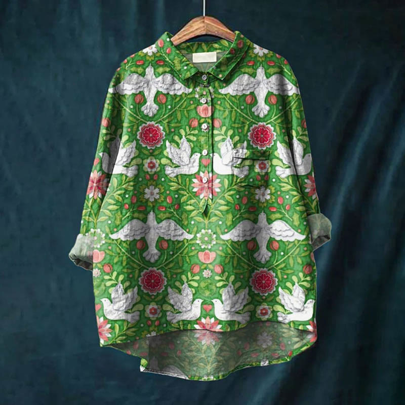 Dashingsoul Women's Lovely Flying Pigeon Floral Art Print Casual Lapel Blouse