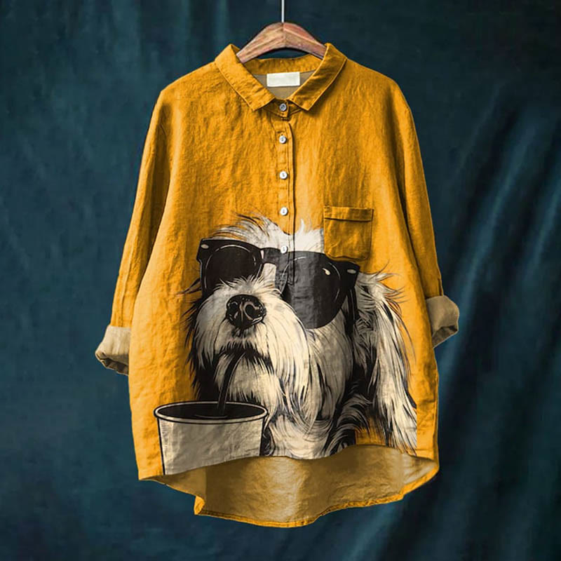 Dashingsoul Women's Oil Painting Sunglasses Drinking Schnauzer Art Print Casual Lapel Blouse