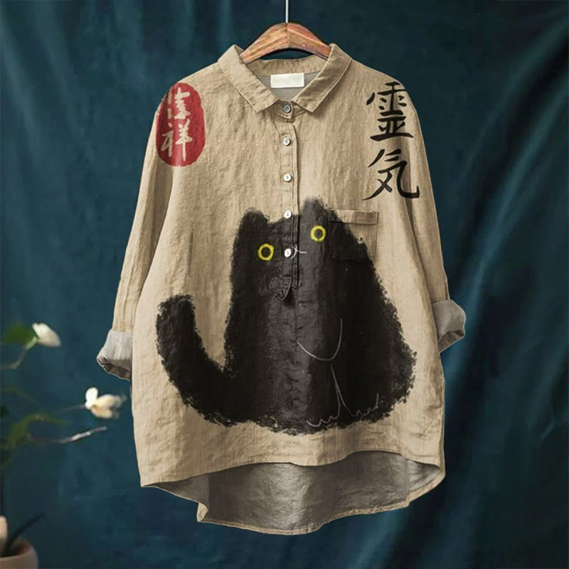 Dashingsoul Japanese Black Cat Art Print Casual Lapel Blouse