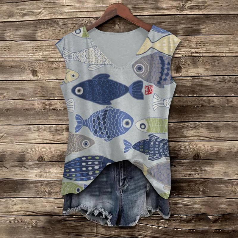 Dashingsoul Artistic Geometric Fish Print Women's Casual V-neck Tank Top