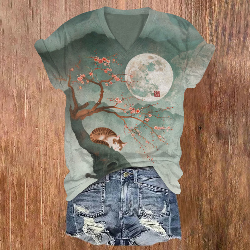 Dashingsoul Blossom On Moonlit Japanese Cat Art Print V-neck T-shirt