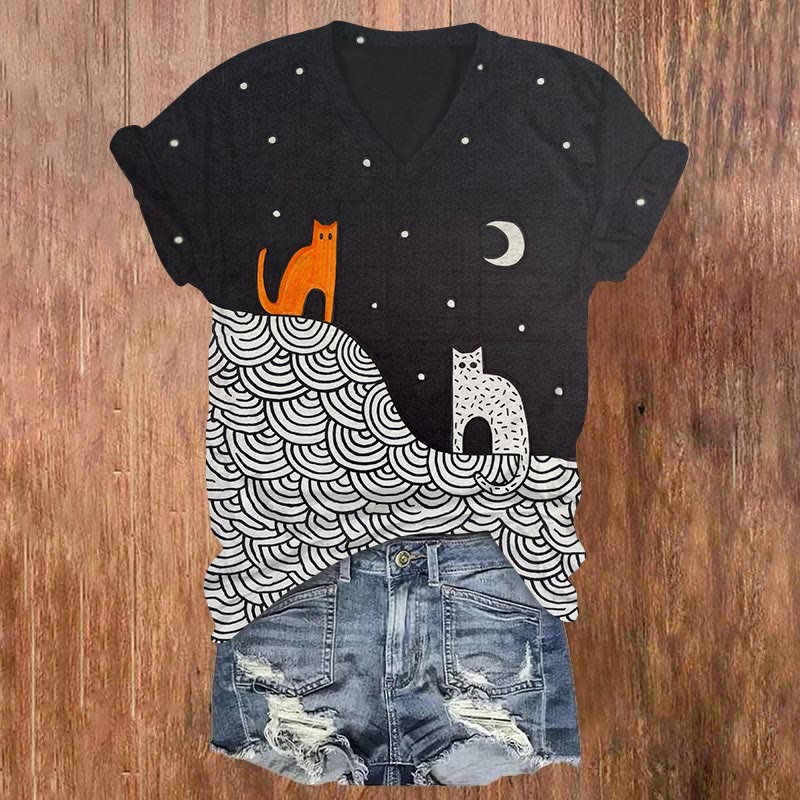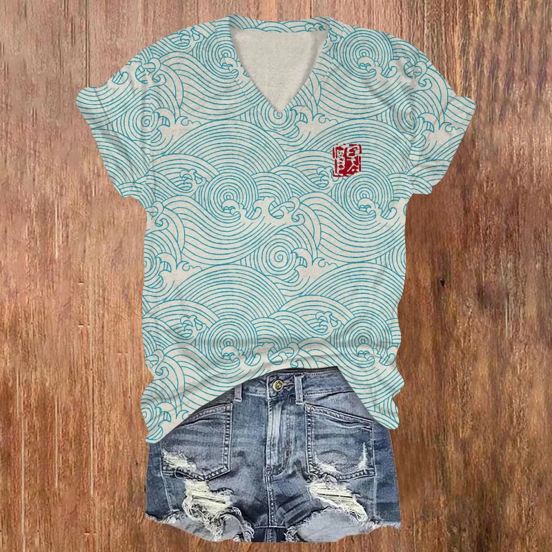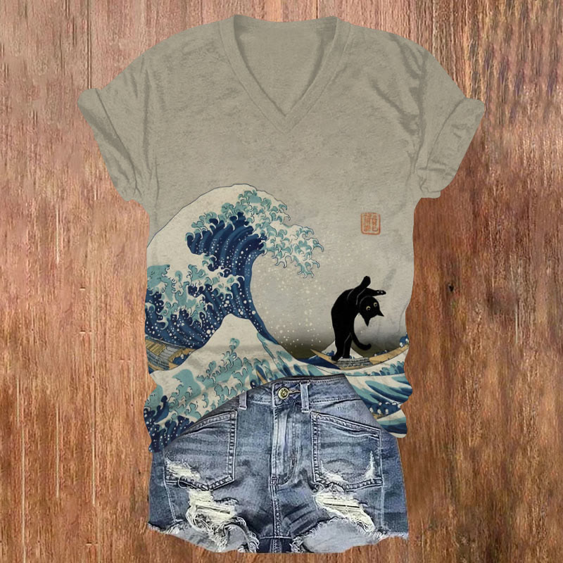 Dashingsoul Japanese Art Cat Backflip Waves Print V-neck T-shirt