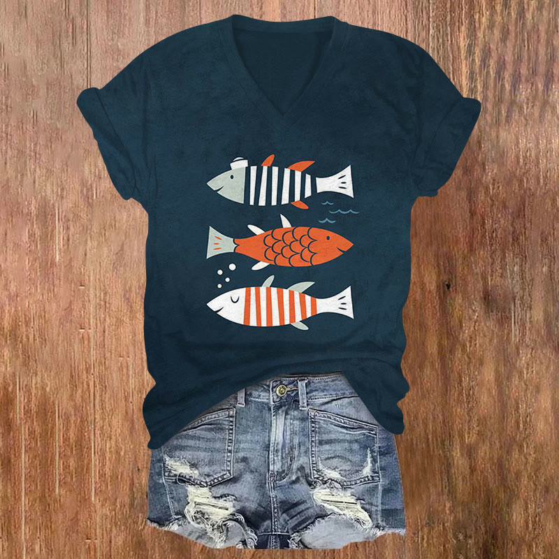 Dashingsoul Cute Simple Drawing Geometric Cartoon Fish Art V-neck T-shirt